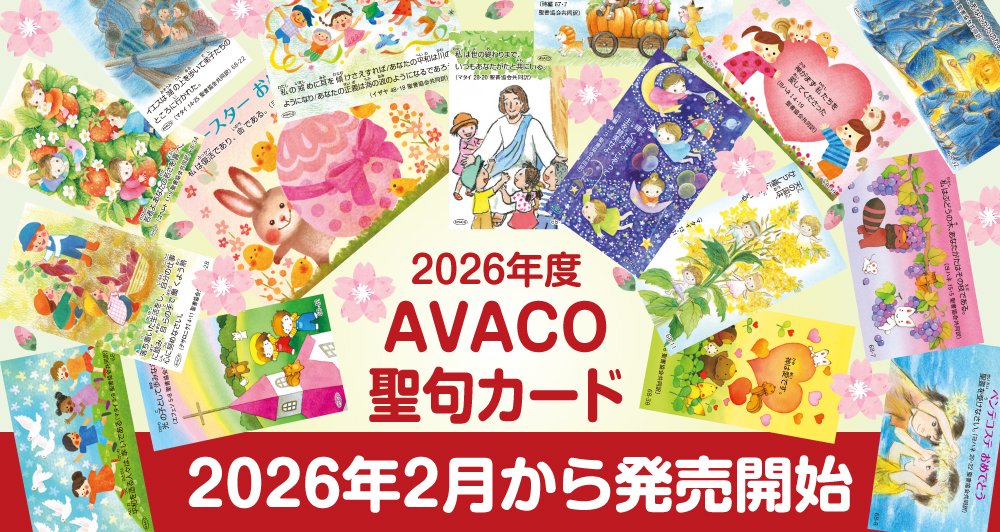 スライダーアイテムリンク AVACOからのお知らせ 【2026/1/1】「子どもと聖書とエキュメニカル運動」検証プロジェクトの情報を更新しました。【2025/12/26】2026年度聖句カード最新情報を公開!【2025/10/7】「第76回キリスト教視聴覚教育講習会」の開催の写真を公開しました【2025/9/8】アドベントカード3「光のクリスマスツリー」光り動画のご紹介【2025/7/14】「手話で福音を伝えよう」電子書籍版を発行しました【2024/12/11】「キリスト教Q&A」のサイトを立ち上げました。 TOPICS カラムリンク イースター/卒園/入学におすすめ商品リーフレット せいしょのおはなしシールブック「みんなで♪うたおうクリスマス AVACO YOUTUBEチャンネル せいしょのおはなしシールブック ノアのはこぶね せいしょのおはなしシールブック そらのとりののはな 黒人霊歌集ア・ホーム・イン・グローリー 教 材 聖句カード、書籍などについてご紹介。 講習会 キリスト教視聴覚講習会はこちらから。 AVACOを身近に♪ SNSで最新情報などをお届けしています。YouTubeではアイデアもご紹介! キリスト教書店検索 教材のご注文はキリスト教書店へお問い合わせください。日キ販のキリスト教書店一覧サイトへ移動します。 AVACOの活動をお支えください。 日本聖書協会の「国内視聴覚事業献金」は、AVACOの事業のため用いられます。皆様のご支援をお願いいたします。 日本聖書協会HP 日本聖書協会は、聖書の翻訳、出版、頒布により、御言葉を全ての人にお届けすることを目的としています。
