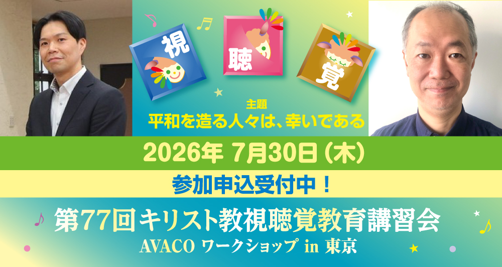 スライダーアイテムリンク スライダーアイテムリンク AVACOからのお知らせ 【2026/4/14】「第77回キリスト教視聴覚教育講習会」の参加申込受付がスタート!New!!【2026/4/7】「子どもと聖書とエキュメニカル運動」検証プロジェクト2026の情報を更新しました【2026/3/2】「手話で福音を伝えよう」オンデマンド版の対応を始めました【2026/1/1】「子どもと聖書とエキュメニカル運動」検証プロジェクトの情報を更新しました。【2025/12/26】2026年度聖句カード最新情報を公開!【2025/10/7】「第76回キリスト教視聴覚教育講習会」の開催の写真を公開しました TOPICS 「子どもと聖書とエキュメニカル運動」検証プロジェクト2026 AVACO YOUTUBEチャンネル せいしょのおはなしシールブック ノアのはこぶね せいしょのおはなしシールブック そらのとりののはな 黒人霊歌集ア・ホーム・イン・グローリー 教 材 聖句カード、書籍などについてご紹介。 講習会 キリスト教視聴覚講習会はこちらから。 AVACOを身近に♪ SNSで最新情報などをお届けしています。YouTubeではアイデアもご紹介! キリスト教書店検索 教材のご注文はキリスト教書店へお問い合わせください。日キ販のキリスト教書店一覧サイトへ移動します。 AVACOの活動をお支えください。 日本聖書協会の「国内視聴覚事業献金」は、AVACOの事業のため用いられます。皆様のご支援をお願いいたします。 日本聖書協会HP 日本聖書協会は、聖書の翻訳、出版、頒布により、御言葉を全ての人にお届けすることを目的としています。