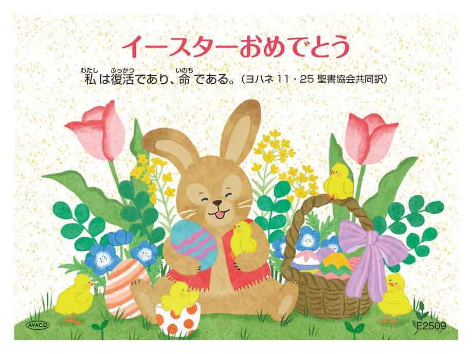 / 最終更新日 : 吉崎礼子 行事聖句カード イースターカードE2509 販売教材の種類 行事 聖句カード価格(税込) ¥ 30内容紹介 聖句/私は復活であり、命である。(ヨハネ11・25) ハガキ1/2サイズのイースターカード FacebookXBlueskyCopy
