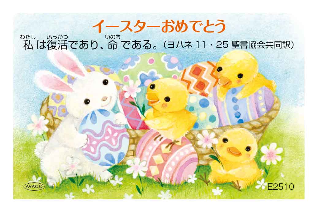 / 最終更新日 : 吉崎礼子 行事聖句カード イースターカードE2510 販売教材の種類 行事 聖句カード価格(税込) ¥ 15内容紹介 聖句/私は復活であり、命である。(ヨハネ11・25) ハガキ1/4サイズのイースターカード FacebookXBlueskyCopy